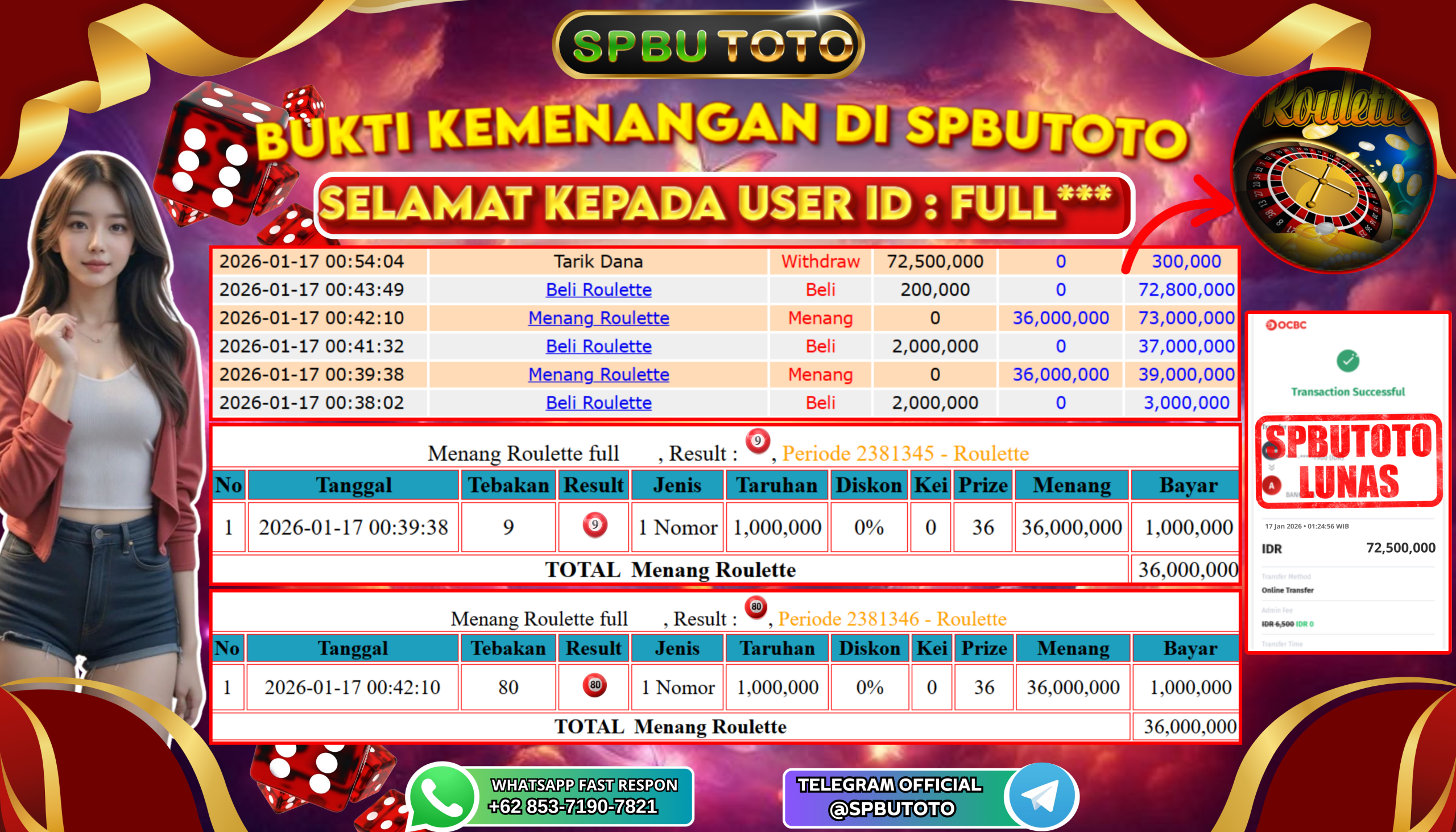 BUKTI JACKPOT LIVE GAME 17 Januari 2026 Posted by Customer Service 2 ROULETTE SABTU, 17 JANUARI 2026 RP 72,500,000,- SELAMAT KEPADA PEMENANG, SALAM JP Updated: 17 Januari 2026 at 04:56 ◀ BUKTI JACKPOT SLOT GAME
