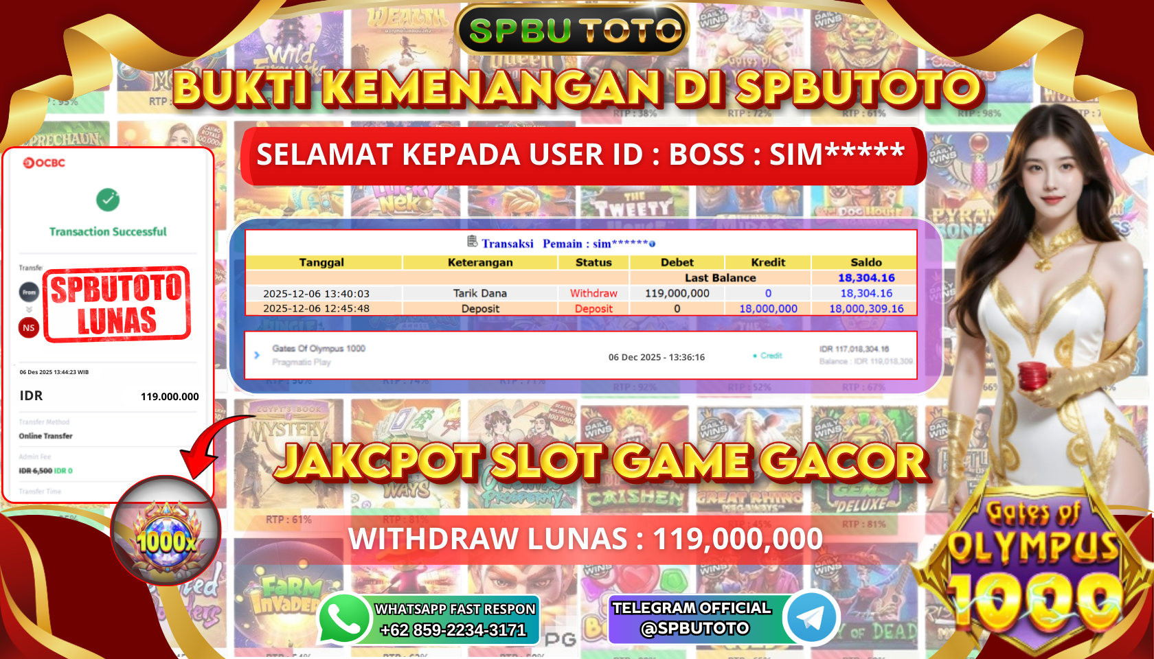BUKTI JACKPOT SLOT GAMES 6 Desember 2025 Posted by Customer Service 2 GATES OF OLYMPUS 1000 SABTU, 06 DESEMBER 2025 RP 119.000.000,- SELAMAT KEPADA PEMENANG, SALAM JP! Updated: 10 Desember 2025 at 20:59 ◀ BUKTI JACKPOT SLOT GAMES PREDIKSI KENTUCKY MID ▶