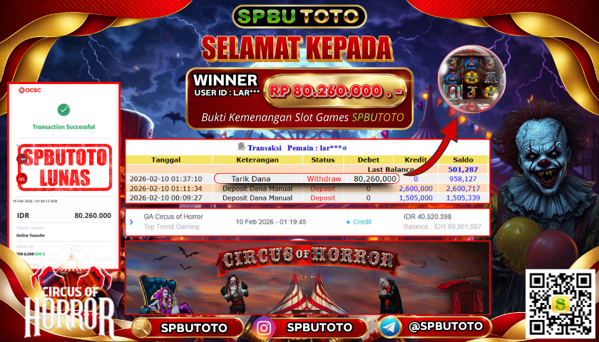 BUKTI JACKPOT SLOT GAMES 10 Februari 2026 Posted by Admin SPBUTOTO GA CIRCUS OF HOROR SELASA, 10 FEBRUARY 2026 RP 80,260,000,- SELAMAT KEPADA PEMENANG, SALAM JP Updated: 10 Februari 2026 at 02:42 ◀ PREDIKSI OREGON 09 BUKTI JACKPOT SLOT GAMES ▶
