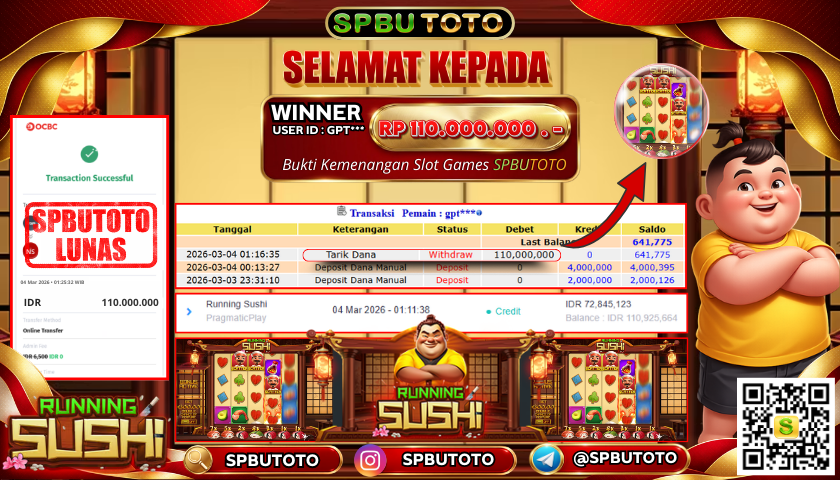 BUKTI JACKPOT SLOT GAMES 4 Maret 2026 Posted by Admin SPBUTOTO RUNNING SUSHI RABU, 04 MARET 2026 RP 110,000,000,- SELAMAT KEPADA PEMENANG, SALAM JP Updated: 4 Maret 2026 at 01:57 ◀ BUKTI JACKPOT SLOT GAMES
