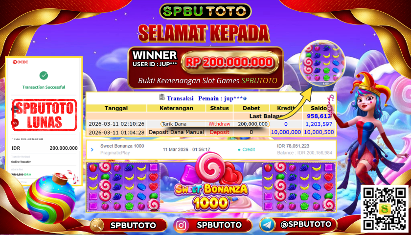 BUKTI JACKPOT SLOT GAMES 11 Maret 2026 Posted by Admin SPBUTOTO SWEET BONANZA 1000 RABU, 11 MARET 2026 RP 200,000,000,- SELAMAT KEPADA PEMENANG, SALAM JP Updated: 11 Maret 2026 at 02:49 ◀ BUKTI JACKPOT SLOT GAMES PREDIKSI JITU HONGKONG LOTTO ▶