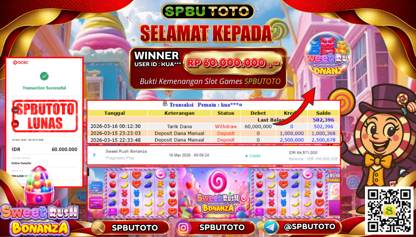 BUKTI JACKPOT SLOT GAMES 16 Maret 2026 Posted by Admin SPBUTOTO SWEET RUSH BONANZA SENIN, 16 MARET 2026 RP 60,000,000,- SELAMAT KEPADA PEMENANG, SALAM JP Updated: 16 Maret 2026 at 04:38 ◀ PREDIKSI JITU OREGON12 POOLS BUKTI JACKPOT SLOT GAMES ▶