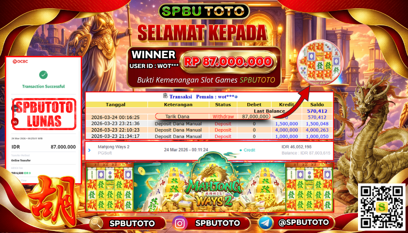 BUKTI JACKPOT SLOT GAMES 24 Maret 2026 Posted by Admin SPBUTOTO MAHJONG WAYS 2 SELASA, 24 MARET 2026 RP 87,000,000,- SELAMAT KEPADA PEMENANG, SALAM JP Updated: 24 Maret 2026 at 03:22 ◀ PREDIKSI JITU CAMBODIA POOLS BUKTI JACKPOT SLOT GAMES ▶