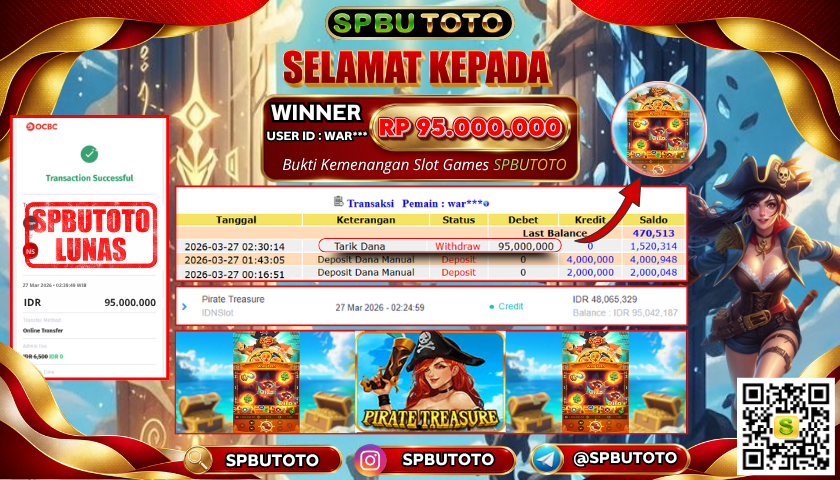 BUKTI JACKPOT SLOT GAMES 27 Maret 2026 Posted by Admin SPBUTOTO PIRATE TREASURE JUMAT, 27 MARET 2026 RP 95,000,000,- SELAMAT KEPADA PEMENANG, SALAM JP Updated: 27 Maret 2026 at 03:29 ◀ BUKTI JACKPOT SLOT GAMES PREDIKSI JITU BULLSEYE POOLS ▶