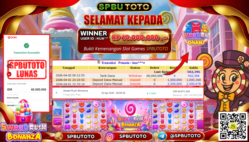 BUKTI JACKPOT SLOT GAMES 2 April 2026 Posted by Admin SPBUTOTO SWEET RUSH BONANZA KAMIS, 02 APRIL 2026 RP 60.000.000 SELAMAT KEPADA PEMENANG, SALAM JP Updated: 2 April 2026 at 03:36 ◀ BUKTI JACKPOT SLOT GAMES BUKTI JACKPOT SLOT GAMES ▶