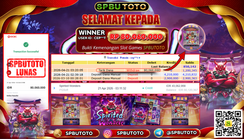BUKTI JP SLOT GAME 21 April 2026 Posted by Admin SPBUTOTO SPRITED WONDERS SELASA, 21 APRIL 2026 RP 80.060.000 SELAMAT KEPADA PEMENANG, SALAM JP Updated: 21 April 2026 at 07:38 ◀ BUKTI JP SLOT GAME BUKTI JP SLOT GAME ▶